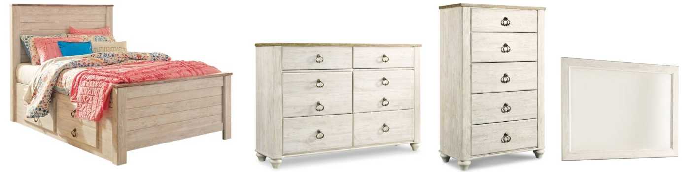 Includes full panel bed with storage (headboard, footboard, rails, 2 storage drawers, roll slats), dresser with mirror, and chest of drawers