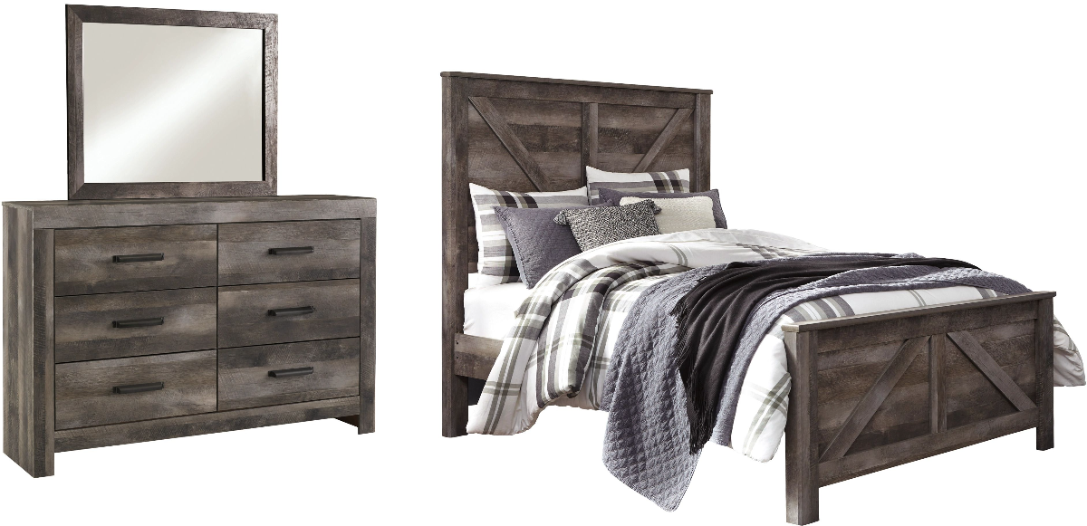Includes queen crossbuck panel bed (headboard, footboard and rails), dresser and mirror.